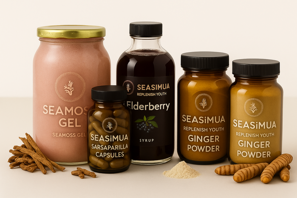 60 Seamoss Capsules, 60 Burdock Capsules , Fenugreek water , Beetroot juice (250ml), Lions mane and St johns worts ,Turmeric ,Cayenne , Moringa , Cinnamon